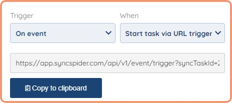 Automatic task runs On Event allows the task to be executed when an action is performed in the Source Platform, a SyncSpider task or through a URL Trigger.