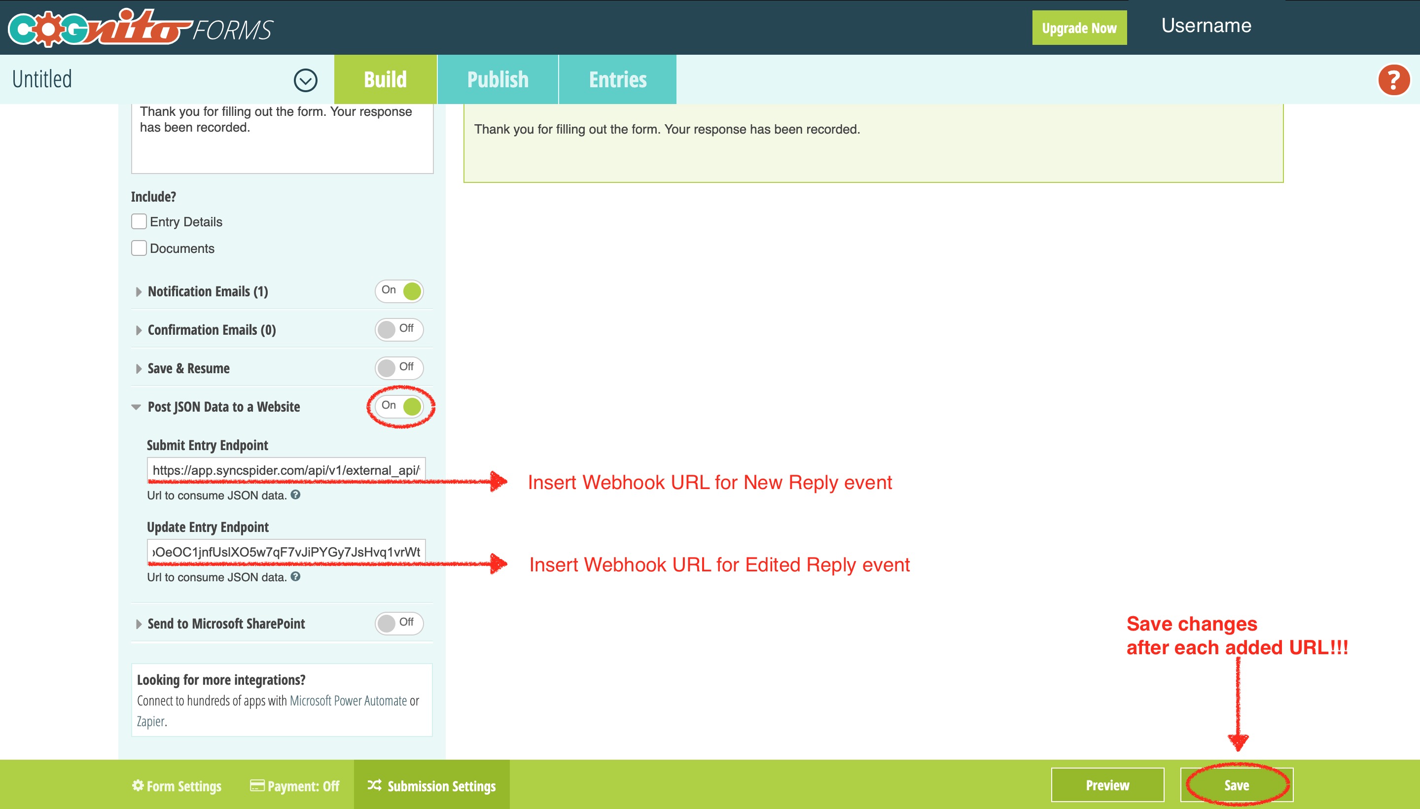 Perform Steps 4-7 for the Edited Reply pasting the URL on Cognito Forms into the Update Entry Endpoint input field and testing by editing an existing response.