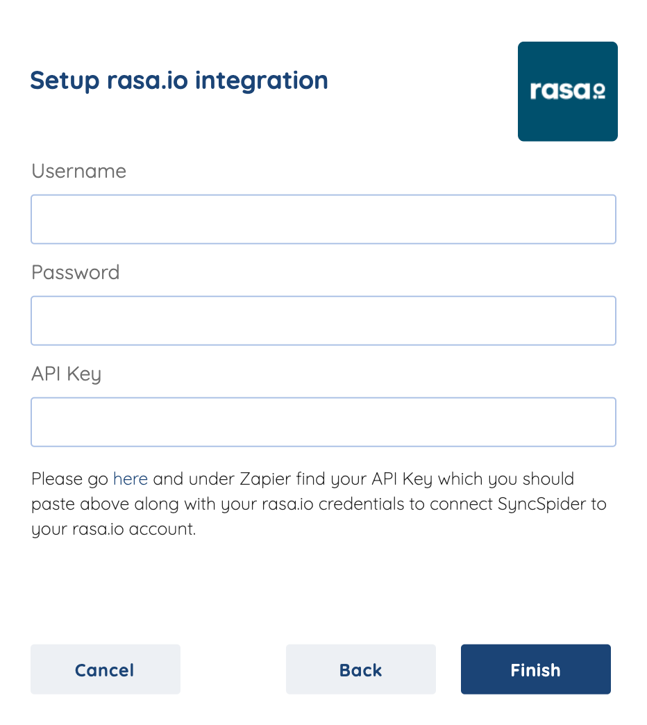 Locate the API Key, then copy and paste it into the last credentials input field of the SyncSpider integration setup window.