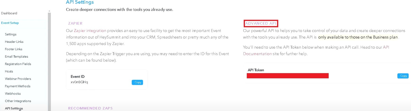 To obtain the API key, head over to the HeySummit platform. In the left portion on the screen, click on "Event Setup", and then on "API Settings", as shown in the picture below: