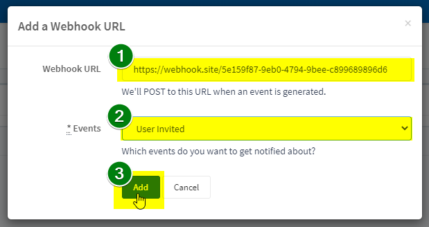 In the Add a Webhook URL modal that appears, paste in your Webhook URL and in the Events dropdown select the event that you'd like to get notified about and get Prefinery to POST data to SyncSpider. Click on the Add button to complete this step.