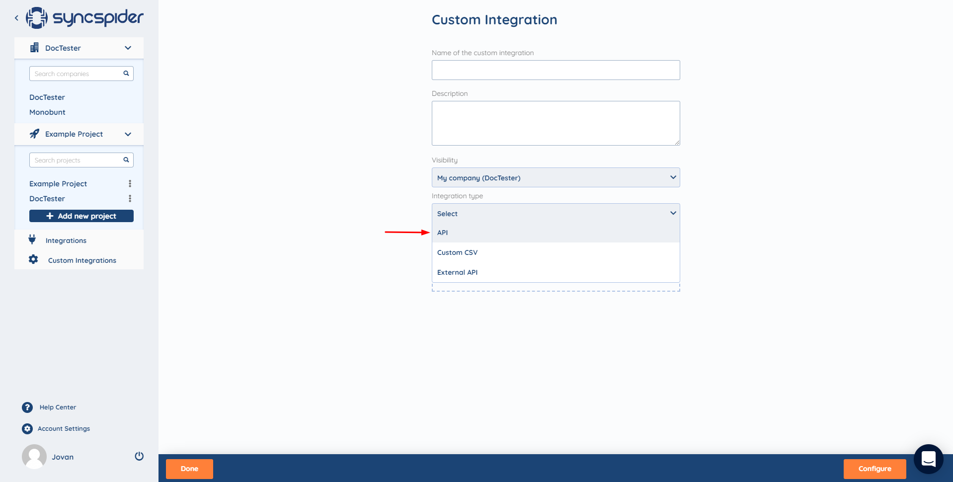 Select the Integration Type as "API" and fill out the required fields and click Configure.