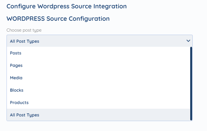 There are several types that we can filter in and out: Posts, Pages, Media, Blocks and Products. For the purpose of this guide we will leave all of them in, therefore selecting All Post Types.