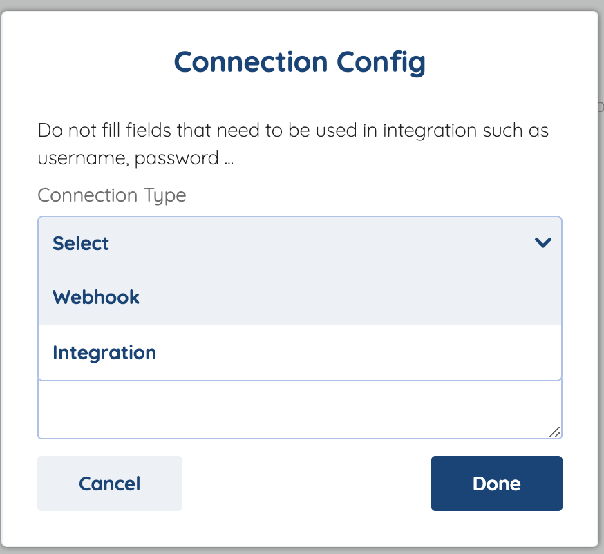 Go to "Connection Config" and select "Webhook" in the dropdown list for Connection Type. Click "Done".