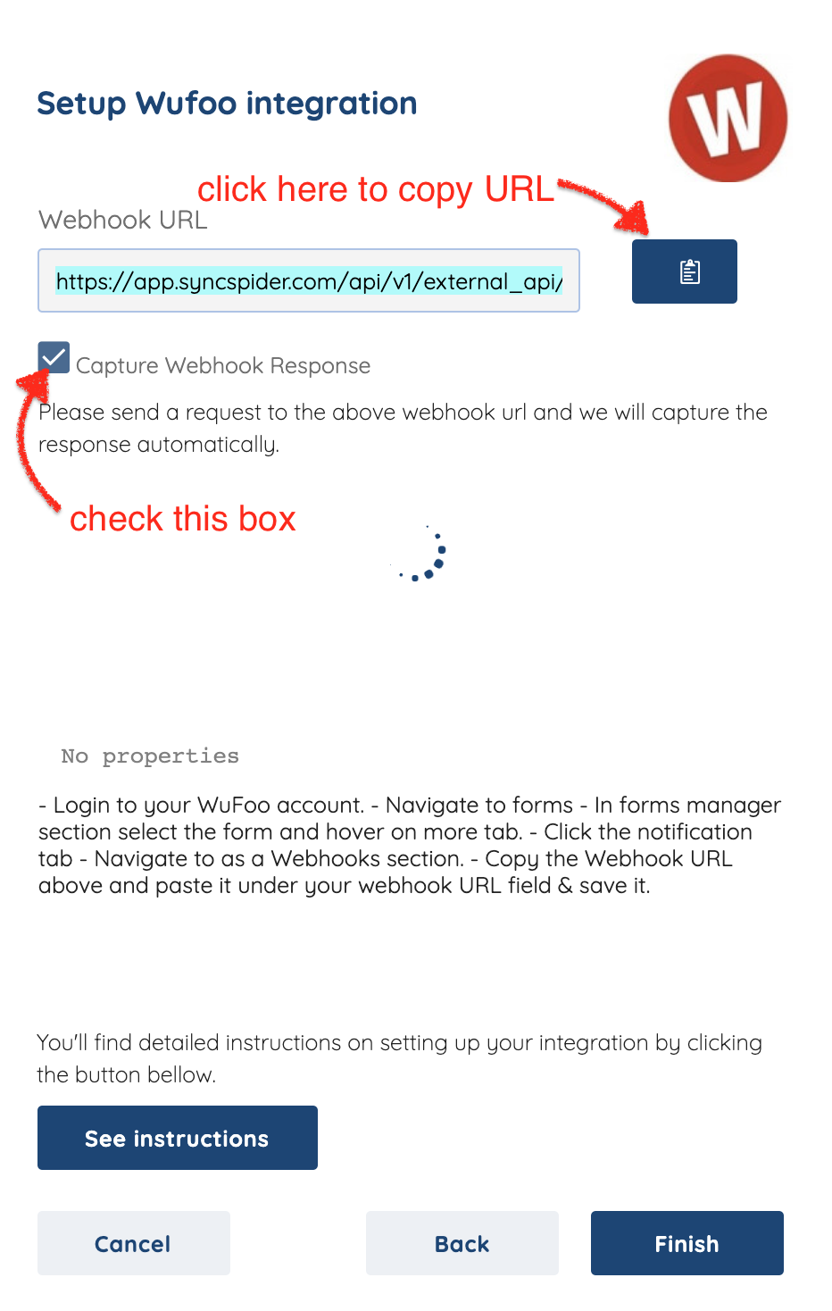 Initiate the trigger event to get a webhook response. Go back to SyncSpider to verify that your webhook response has been successfully captured. This will be indicated through text appearing in the setup window. Finish/Save your new integration.