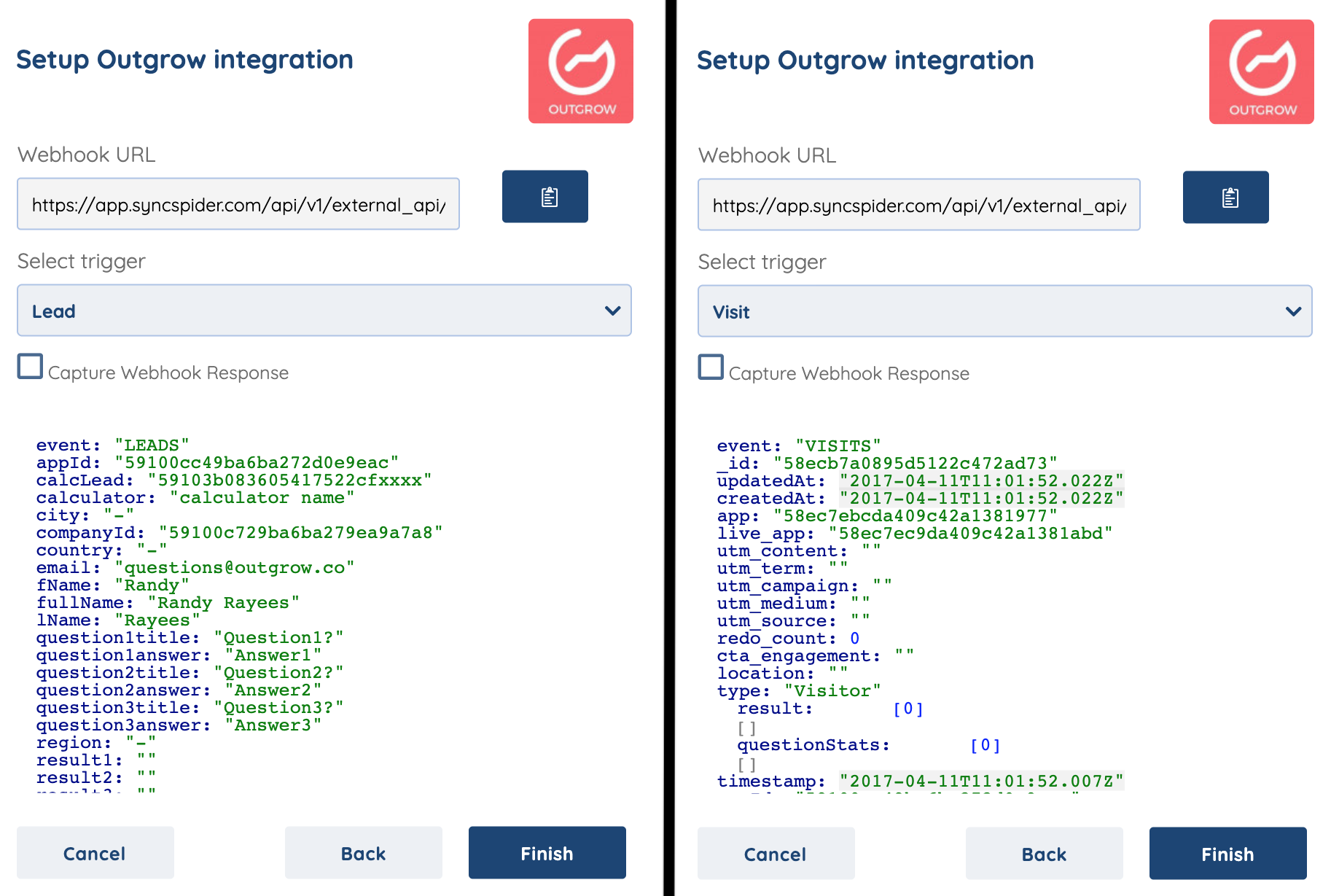 Go back to SyncSpider to verify that your Webhook response has been successfully captured. This will be indicated through text body of the response appearing in the setup window.