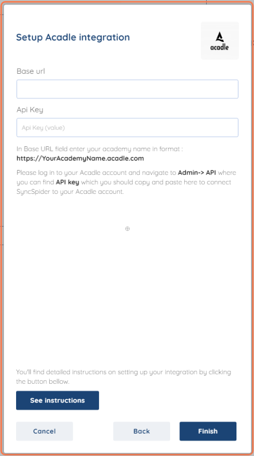 For the API Key Please log in to your Acadle account and navigate to Admin-> API where you can find the API key which you should copy and paste here to connect SyncSpider to your Acadle account.