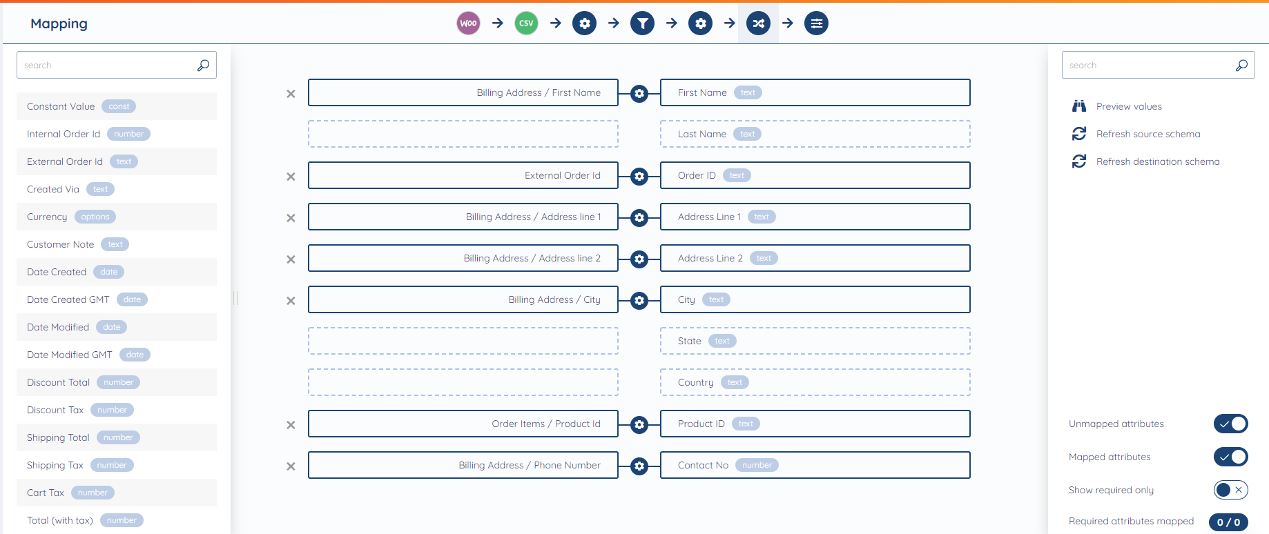 Select Woocomerce as source configuration and choose "Order"  as a source.