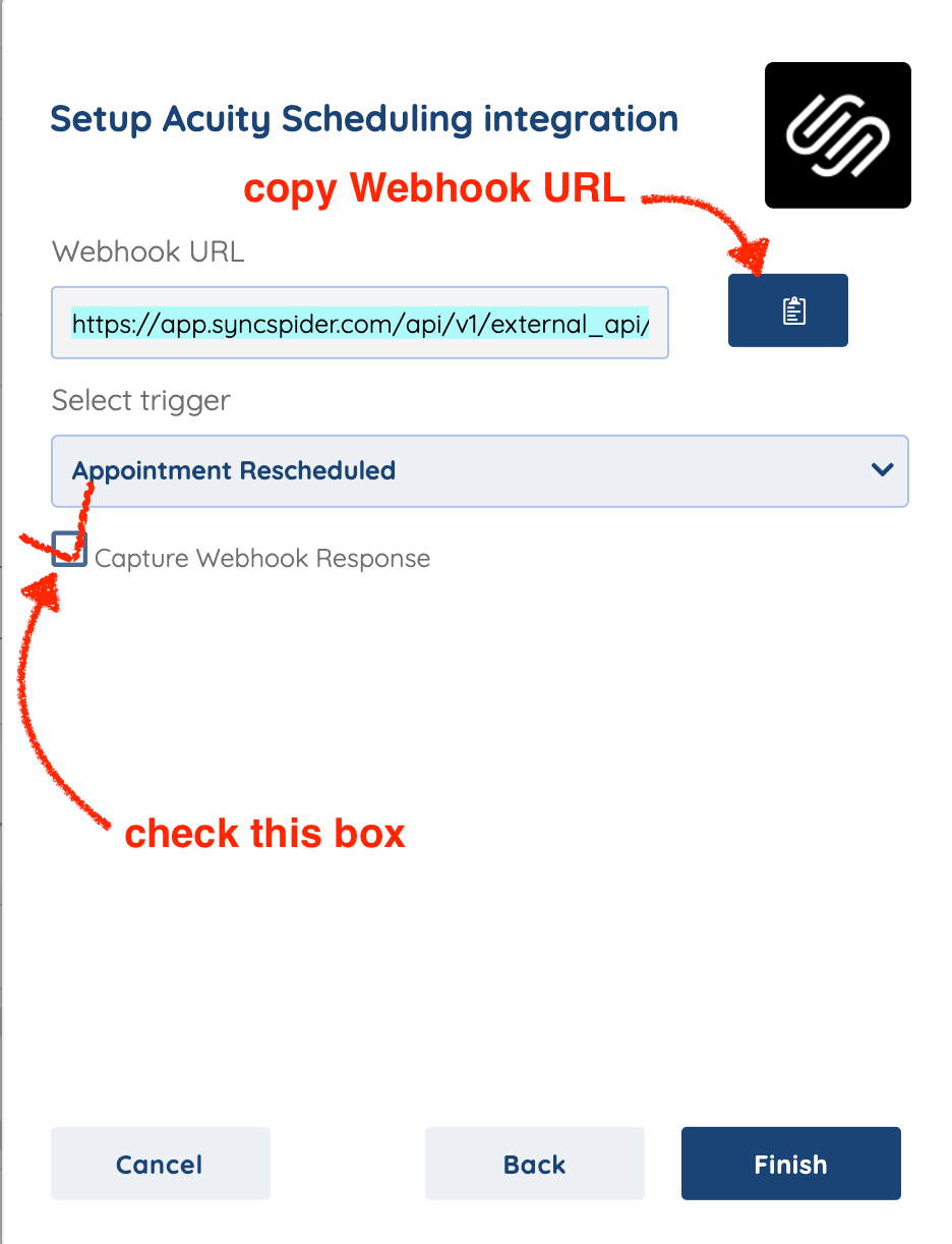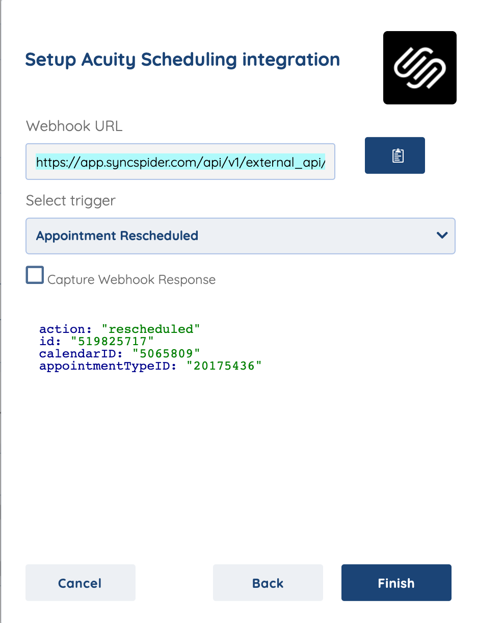Initiate the trigger event to get a webhook response. Go back to SyncSpider to verify that your webhook response has been successfully captured. This will be indicated through text appearing in the setup window.