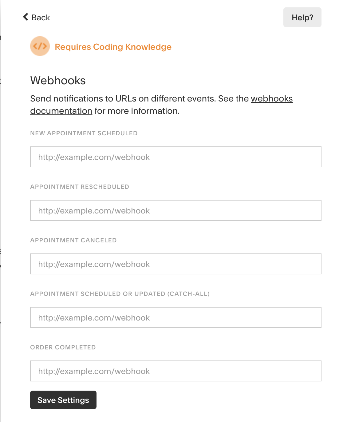 In another tab or window log in to Acuity Scheduling. Select the Integrations section from the toolbar on the left of the screen. Then click the Webhooks icon indicated in the screenshot.
