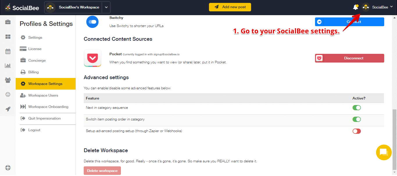 In a new tab or window please login to your Socialbee account. Select the Workspace Settings section from the left side pane and enable Advanced posting setup.
