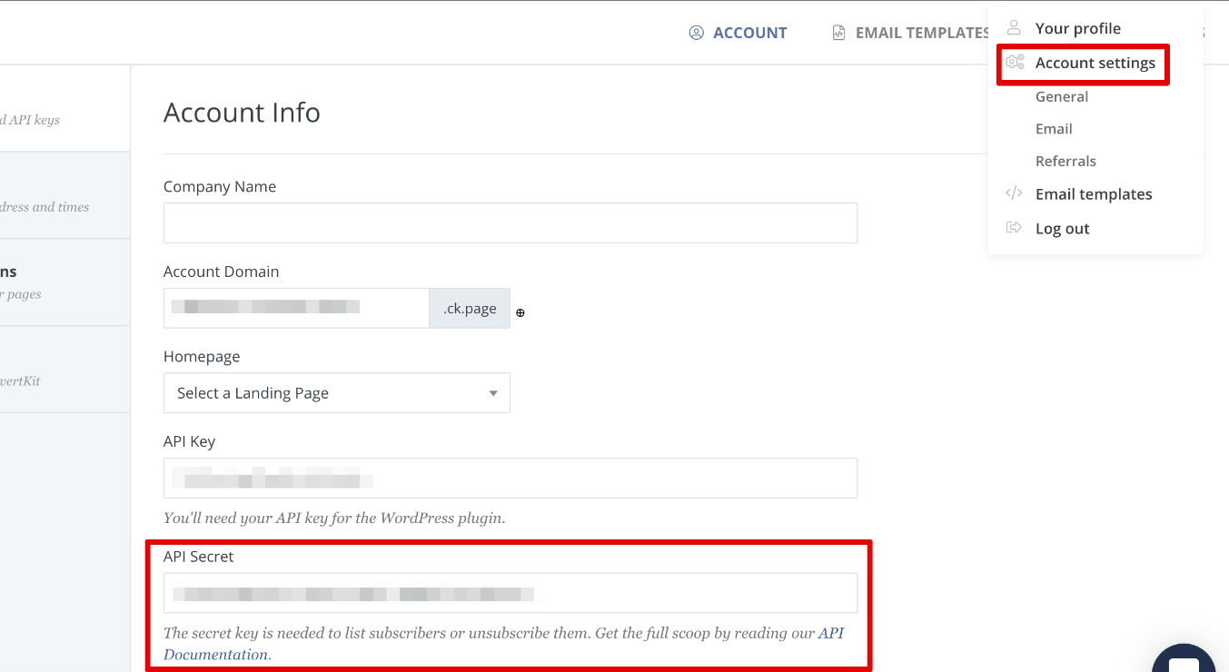 Go to your ConvertKit account and Click on Profile Picture in top Menu section and then click on Account Settings.