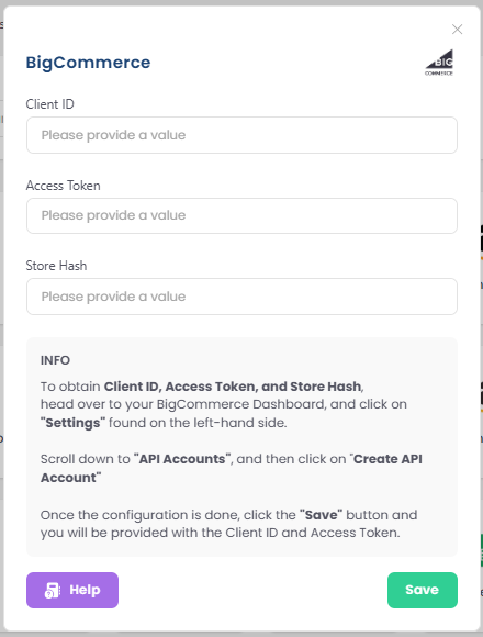 You will be prompted to enter your BigCommerce Client ID, Access Token and Sore Hash.